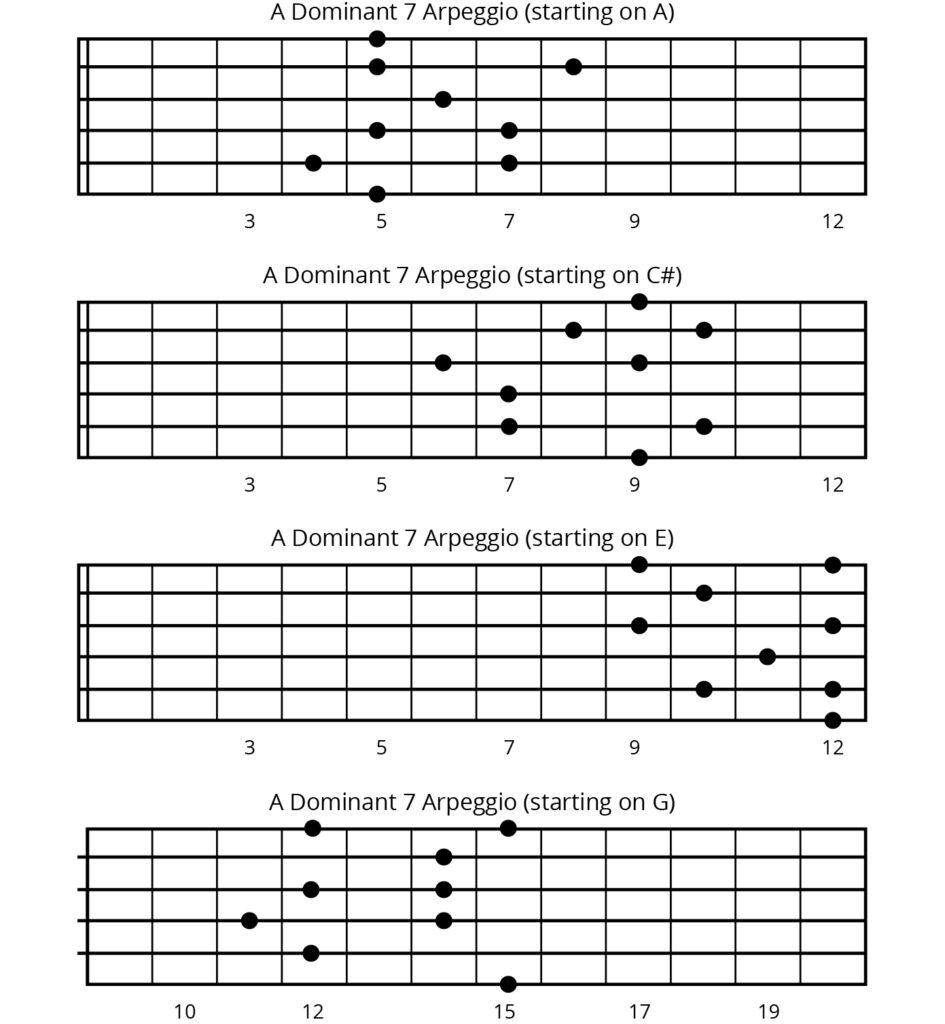 These are the four shapes I use when improvising over dominant 7 chords. Getting a handle on each one will help you know what notes to play over dominant chords. The more you practice visualizing these shapes on the fret board the easier it will be to find your way around. It’s like learning to walk. It is very slow at first, but as you practice these shapes you will start having little epiphanies along the way and at times you will really surprise yourself at how fluently you can move around the fret board.
