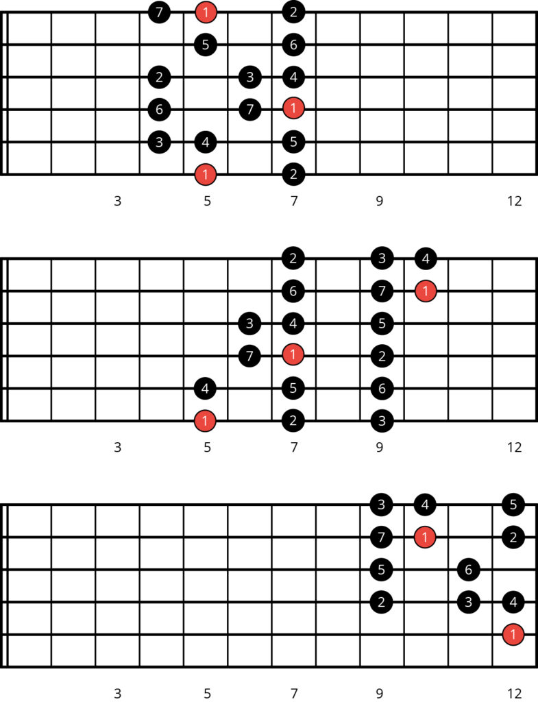 This is basically the major scale mapped out in 3 common positions on the fret board. As far as familiarizing yourself with these patterns goes just start with the first one and get it down solid. Then, move to the others. For me, the second one is uncomfortable, but it’s still important to be able to visualize the notes.